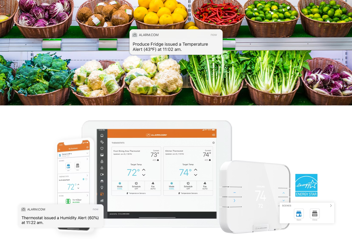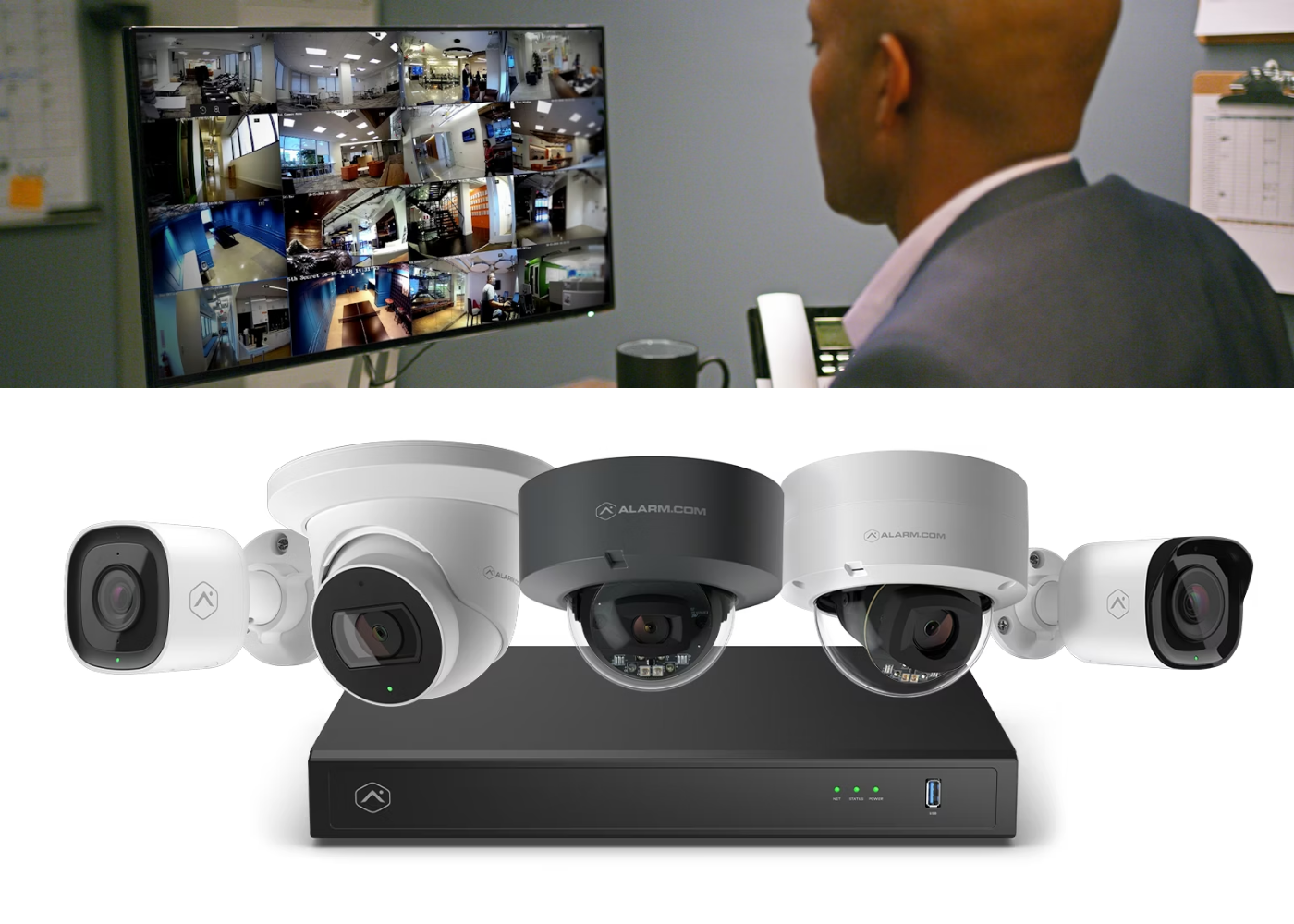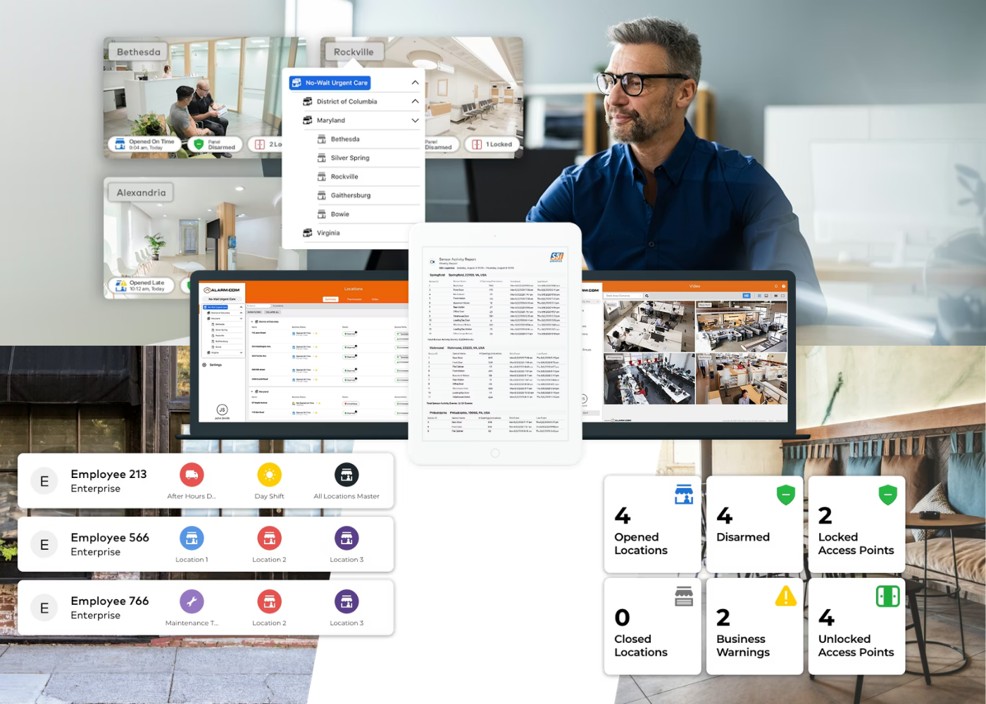 Alarm.com’s commercial platform unifies intrusion, video, access, energy, fleet, and gunshot detection into a cloud-managed solution built to increase operational efficiency, reduce overhead, and strengthen protection across complex sites.