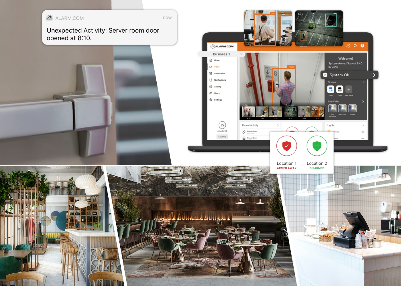 Built for growing organisations, Alarm.com allows users to manage multiple properties from one centralised dashboard, with combined video oversight, access management, system visibility, and business insights across locations.