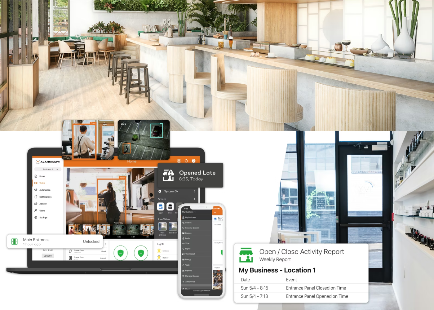 Designed for everyday business operations, Alarm.com helps small businesses manage security, employee access, video awareness, and false alarms more efficiently through professionally installed and monitored connected systems.
